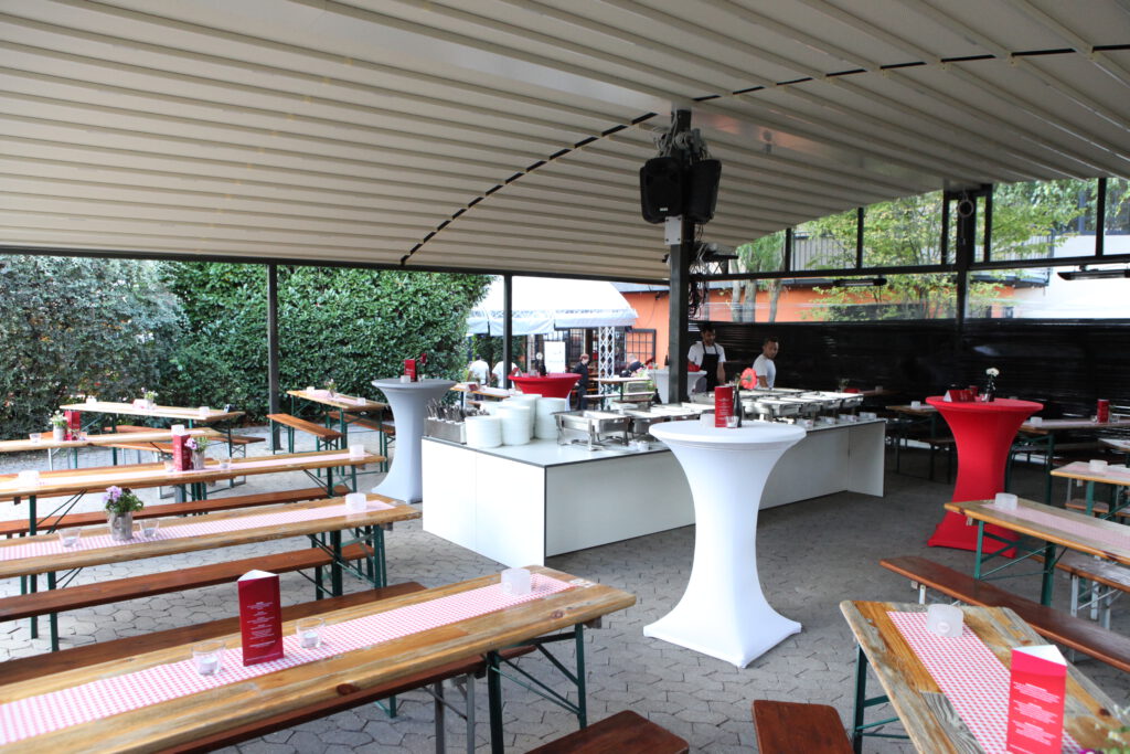 Das Rondell ist ein erhöhter Bereich des Biergartens, welcher mit einer fahrbaren Überdachung und eingebauten Heizstrahler ausgestattet ist.